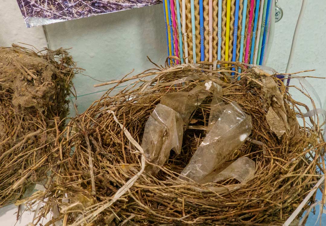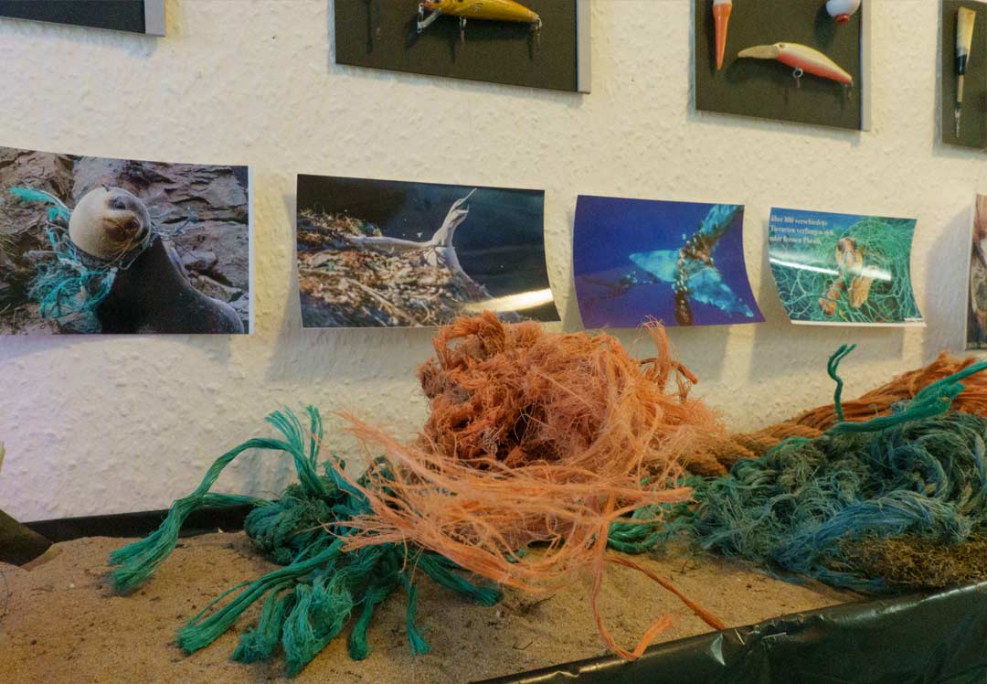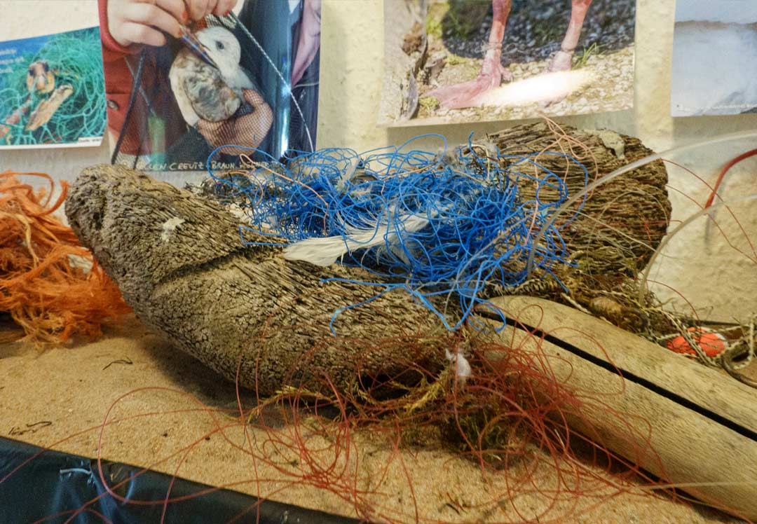 Vogelnester mit Plastikteilen, die gefährlich für die kleinen Küken werden und Netzteile, die von Schiffen fallen und in denen sich Tiere verfangen können.